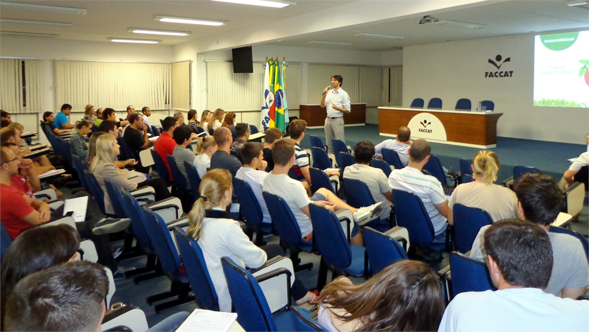 Palestra realizada no dia 28/03 sobre Sustentabilidade de Produtos e Processos reuniu alunos da Engenharia de Produção, Gestão da Qualidade, Administração e Ciências Contábeis da Faccat, além de empresários e comunidade em geral.