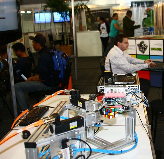 Um desafio maior do que solucionar o quebra-cabeça tridimensional foi desenvolver um robô com essa habilidade. A proposta foi aceita com empenho pelo Grupo de Pesquisa em Robótica Inteligente e Visão Artificial da UFRGS, que trabalha na construção de uma máquina e um software específico para essa finalidade. Alunos de pós-graduação e graduação estão empenhados no projeto há dois meses. O resultado da experiência, ainda em fase de ajustes, também está em exposição no estande do MCTI.