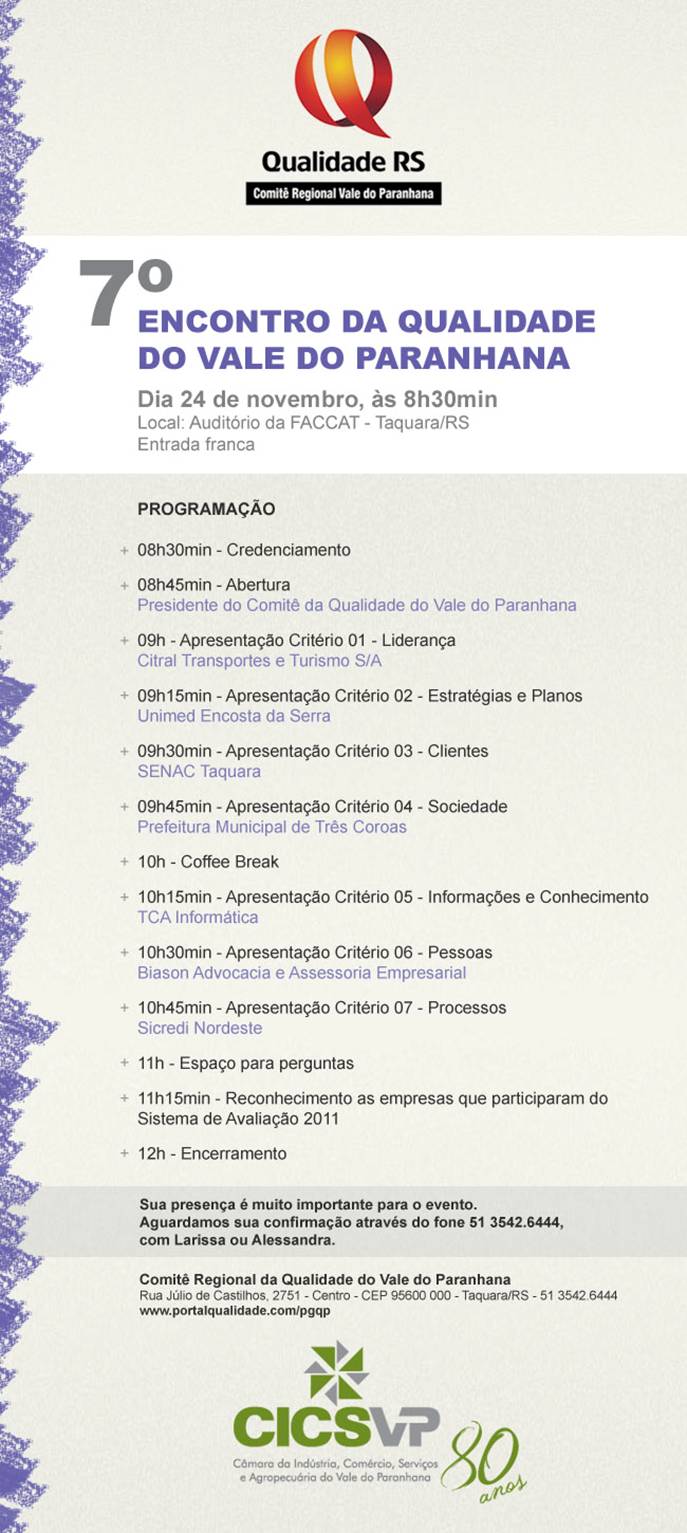 7º Encontro da Qualidade do Vale do Paranhana por Prof. Dr. Carlos Fernando Jung - terça-feira, 22 nov. 2011, 18:02 Número de respostas: 0 Link direto