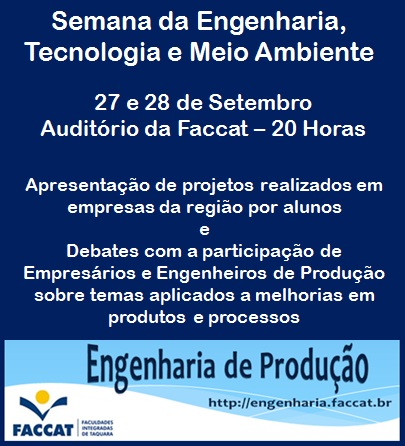 Semana da Engenharia, Tecnologia e Meio Ambiente por Prof. Dr. Carlos Fernando Jung - quarta-feira, 26 set. 2012, 00:44 Número de respostas: 0 . Link direto