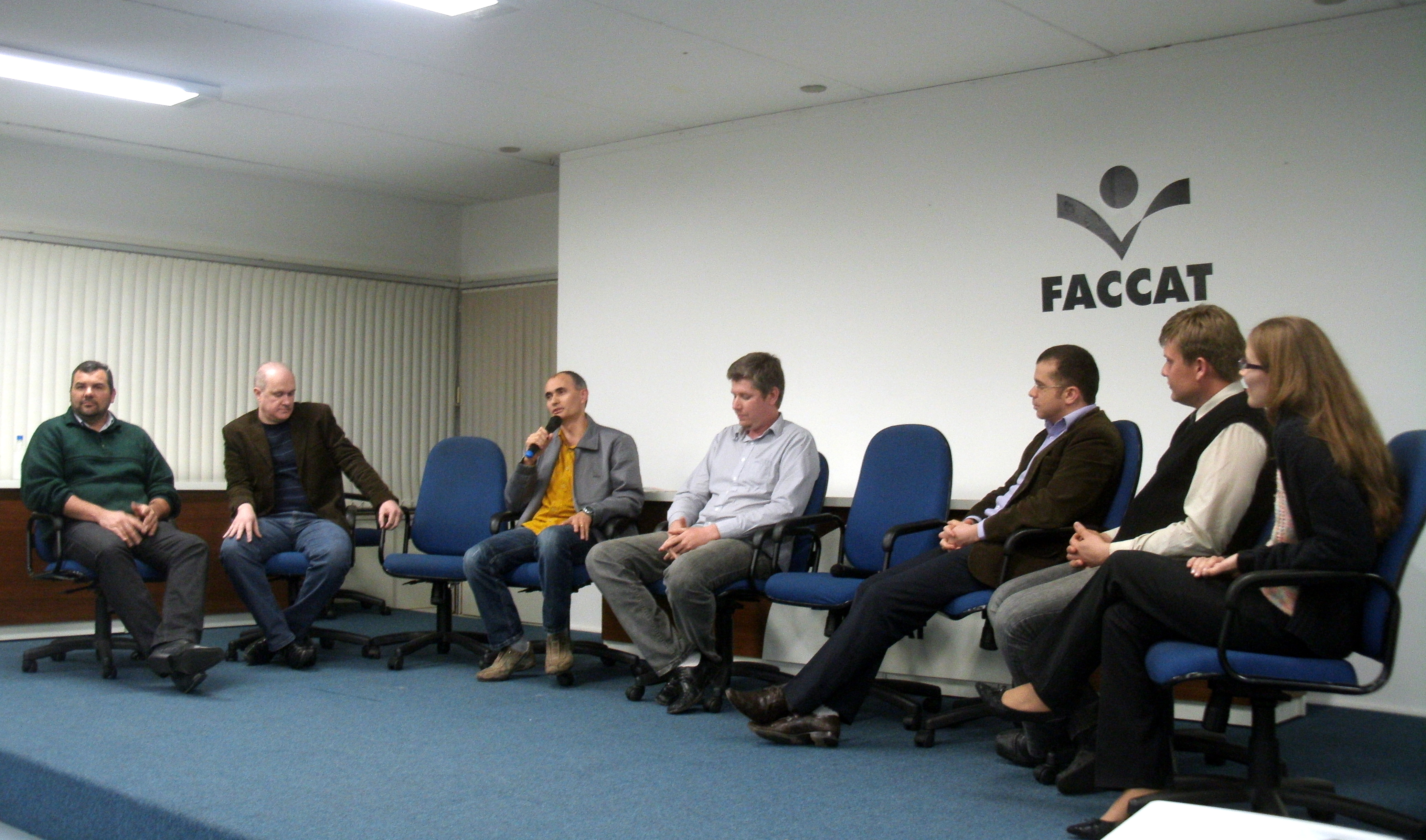 Segunda noite de debates com a participação de Empresários e Engenheiros de Produção sobre melhoria da produtividade e inovação de sistemas de produção na SEMANA DA ENGENHARIA, TECNOLOGIA E MEIO AMBIENTE... 28/09 No Auditório da Faccat... — com Eng. Claudio Oberajara Bonetti, Eng. Eduardo Bloos, João Batista Vargas de Souza, Dirceu Linden, Eng. Diego Pacheco, Eng. Flávio Lucas da Rosa e Eng. Heloisa Weber.
