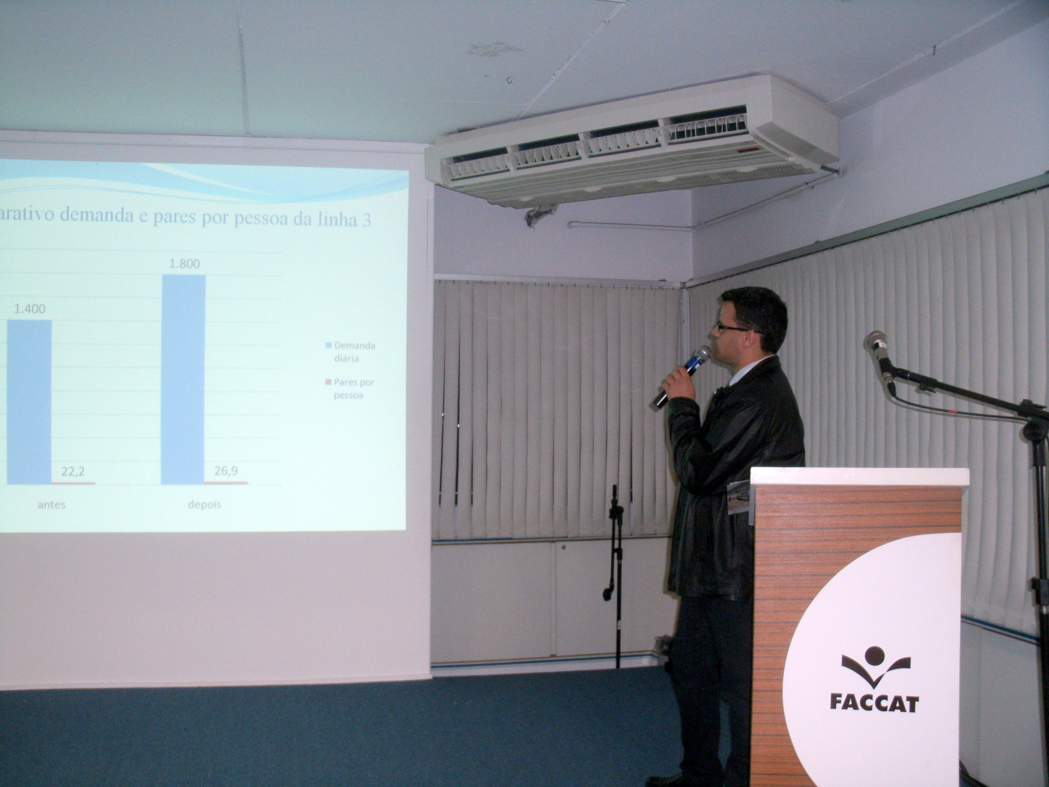 Aluno Eraldo Camargo (formando em Engenharia de Produção - 2012) apresentando sua pesquisa que tratou do estudo e implantação de métodos para balanceamento de linhas de produção em uma empresa do setor calçadista do Paranhana (segunda noite comemorativa da SEMANA DA ENGENHARIA, TECNOLOGIA E MEIO AMBIENTE no dia 28/09 no Auditório da Faccat).