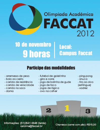 Participe da Olimpíada Acadêmica da Faccat 2012 por Prof. Dr. Carlos Fernando Jung - quarta-feira, 24 out. 2012, 03:19 Número de respostas: 0 Link direto