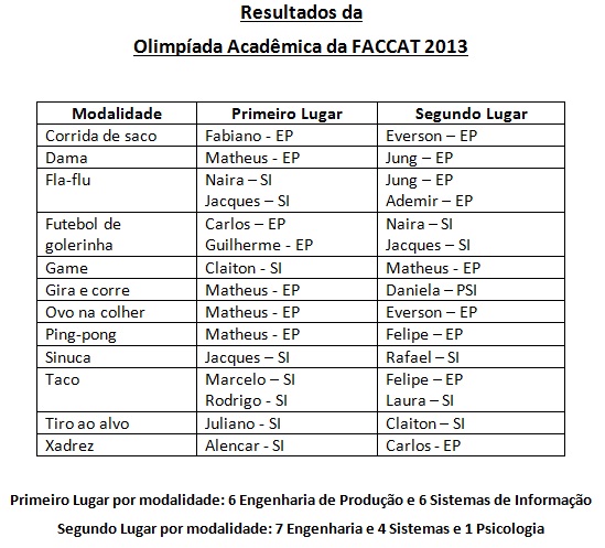 Resultados da Olimpíada 2013 por Prof. Dr. Carlos Fernando Jung - segunda-feira, 21 out. 2013, 17:33 Número de respostas: 0 . Link direto