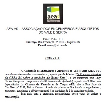 Eng.Civil Cleber Rudolfo Schonerdie (Presidente da AEA-VS) convida todos para esta importante palestra! Recomendado pelo nosso amigo Eng.Mec. Silvio Ballin
